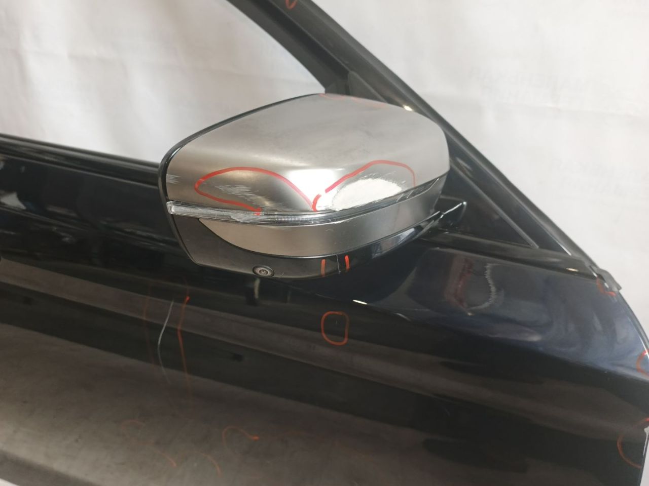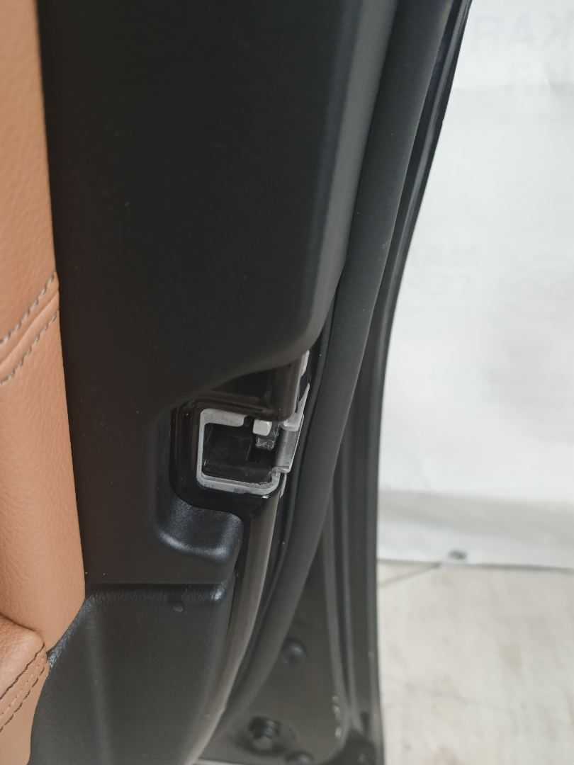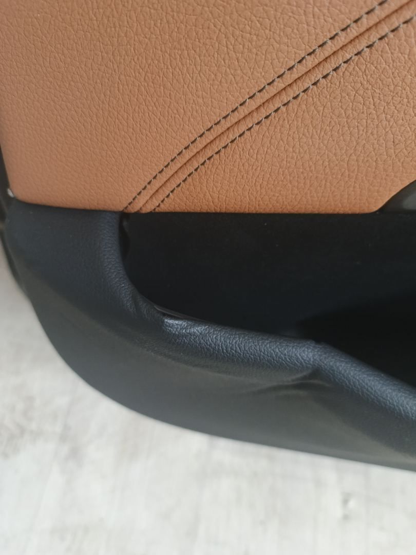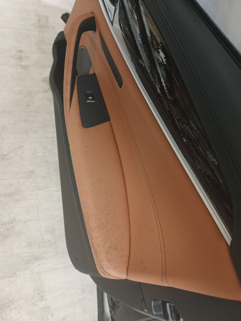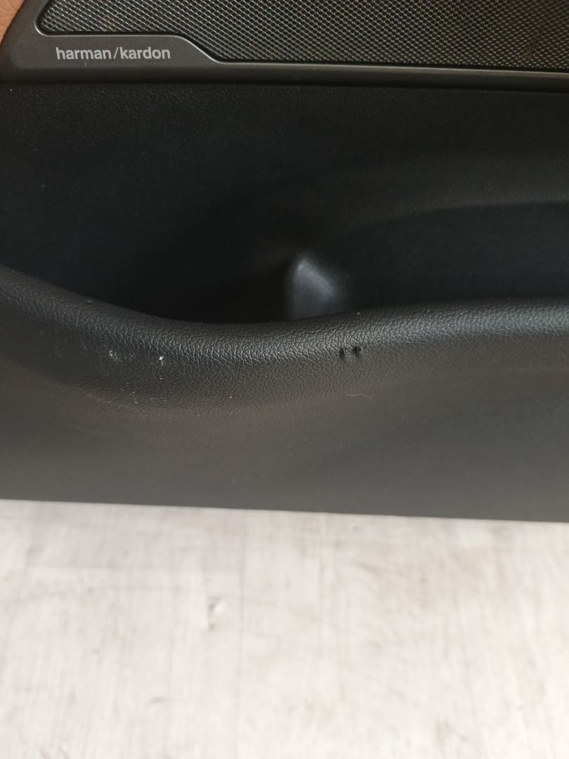 Обшивка дверной карты имеет различные повреждения и загрязнения.